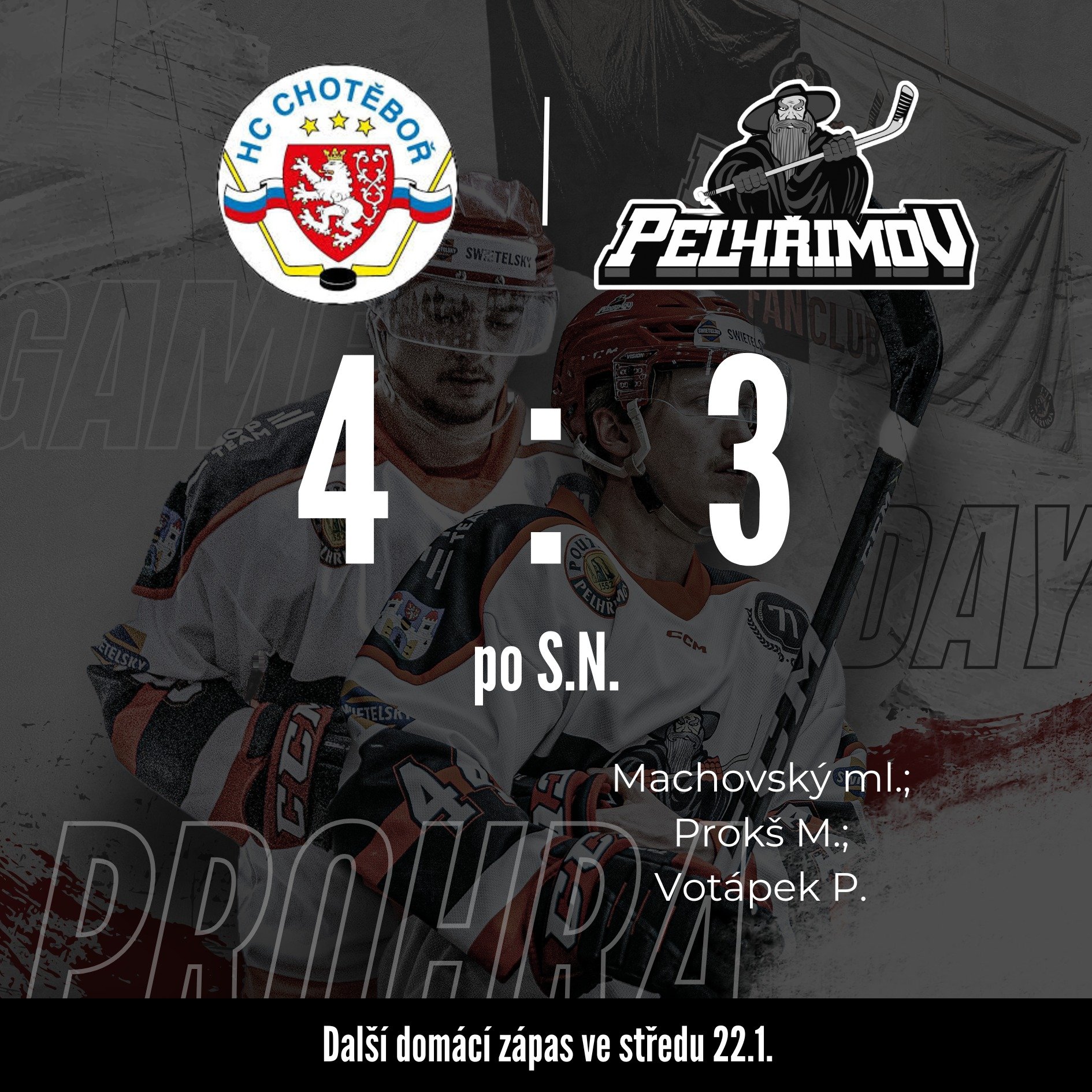 Do zápasu mezi Chotěboří a Pelhřimovem zasáhli brankářské dvojky na obou stranách, v domácí brance nastoupil Vít, do pelhřimovské branky se postavil Roh. Po bezbrankové první třetině se na první gól v utkání čekalo až do 36.minuty, kdy poslal Poutníky do vedení Max Machovský. Ve 39.minutě sice domácí tým během početní nevýhody vyrovnal zásluhou Svobody, ale do druhé přestávky si stihli pelhřimovští hokejisté vytvořit nadějný dvoubrankový náskok, neboť ve 40.minutě nejprve vrátil vedení na pelhřimovskou stranu využitou přesilovkou Marek Prokš a krátce po něm se prosadil i Petr Votápek. Náskok Poutníků pak vydržel až do závěru třetí třetiny, ale pelhřimovský tým doplatil na nedisciplinovanost. Nejprve v 57.minutě využil přesilovku domácího celku Sedláček a když byla krátce poté Chotěboři nabídnuta další početní výhoda, domácí jí nepohrdli a v 58.minutě vyrovnal stav utkání Lacina. Více se do šedesáti minut nevešlo, utkání směřovalo do prodloužení. Ani nastavený čas o vítězi utkání nerozhodl, došlo tedy na samostatné nájezdy. V nich si o poznání lépe vedli hráči Chotěboře, kteří se prosadili třikrát, zatímco pelhřimovští hráči ani jednou. Vítěznou branku Chotěboře zaznamenal Sedláček. Poutníci tedy nedotáhli do vítězství nadějný rozehraný zápas a vrací se do Pelhřimova s jedním bodem, Chotěboř porazila Pelhřimov 4:3 po samostatných nájezdech.