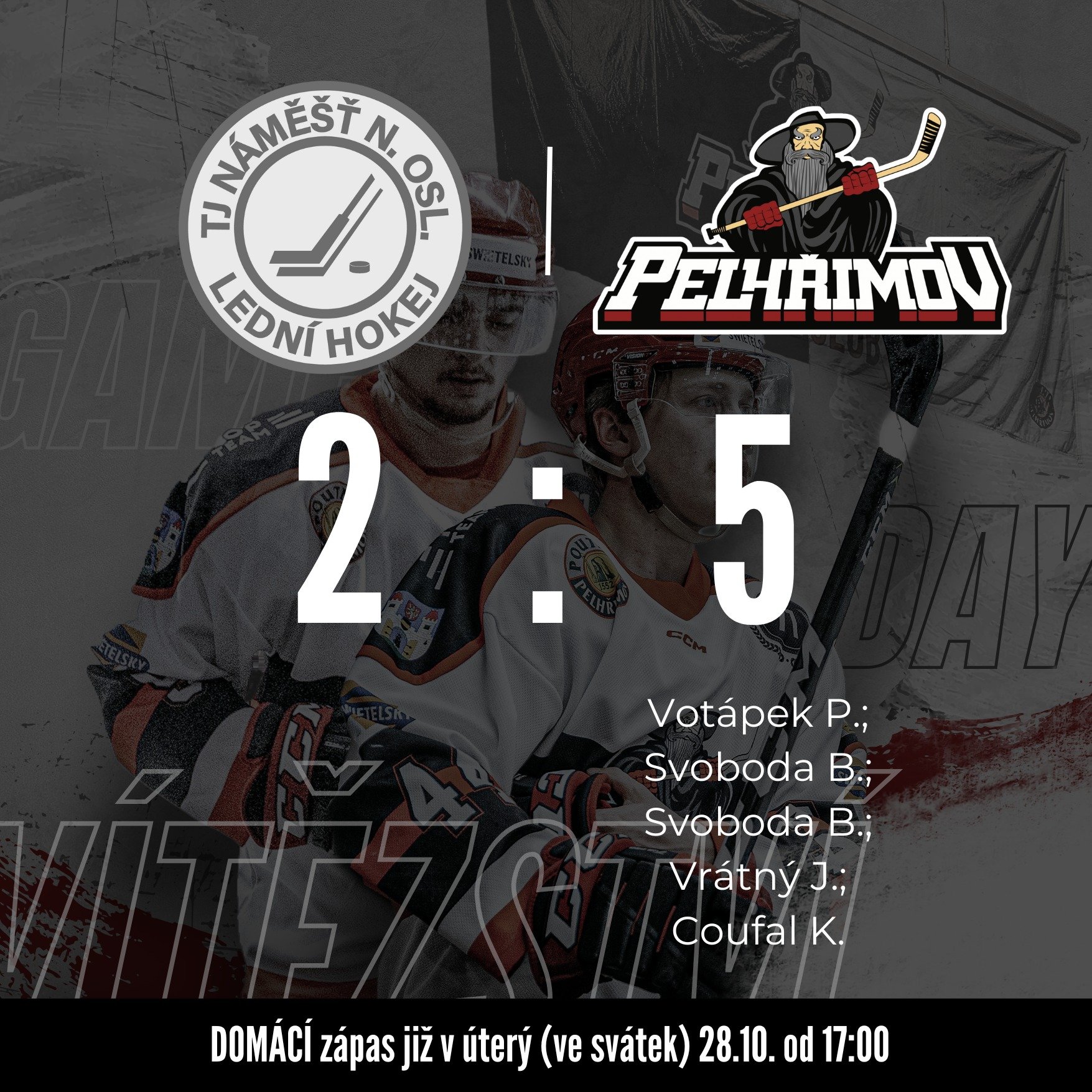 Od úvodních minut byli Poutníci na ledě aktivnější, ale řadu příležitostí nedokázali využít. Totéž ale platilo i pro domácí tým, který v úvodní dvacetiminutovce útočil hlavně z rychlých protiútoků. Po první třetině se tak odcházelo do šaten za bezbrankového stavu. Podobný vývoj měla zpočátku i druhá třetina, ale ve 30.minutě hráli domácí přesilovku, kterou po 16 vteřinách rychle využil expelhřimovský Burian a Náměšť se ujala vedení. Poutníci ale ve zbytku druhé třetiny otočili vývojem utkání. Ve 34.minutě nejprve vyrovnal stav zápasu přesnou střelou Petr Votápek a ve 38.minutě poslal puk do šibenice domácí branky Bohumil Svoboda. A když Bohumil Svoboda ve 40.minutě protlačil puk za záda domácího brankáře potřetí, šli Poutníci podruhé do šaten s dvoubrankovým náskokem. Třetí část hry začal pelhřimovský celek v oslabení, ale krátce po jeho konci se ve 43.minutě prosadil Josef Vrátný. Poutníci byli na koni a ve 47.minutě dostal pelhřimovský celek početní výhodu, kterou se podařilo rychle využít po teči Kevina Coufala. Krátce poté měli početní výhodu i domácí, ovšem nedokázali s ní naložit ideálně. Ale v 54.minutě se domácí tým dočkal snížení, střelou po ledě se prosadil Dvořák. V 59.minutě pak mohli Poutníci své vedení v zápase opět navýšit, měli k dispozici dvojnásobnou početní výhodu, ale skóre zápasu se už do závěrečného hvizdu nezměnilo. Poutníci vyhráli v Náměšti nad Oslavou 2:5 a již v úterý 28.října hostí pelhřimovský tým u Bělé dalšího soupeře, konkrétně rezervní tým Velkého Meziříčí.