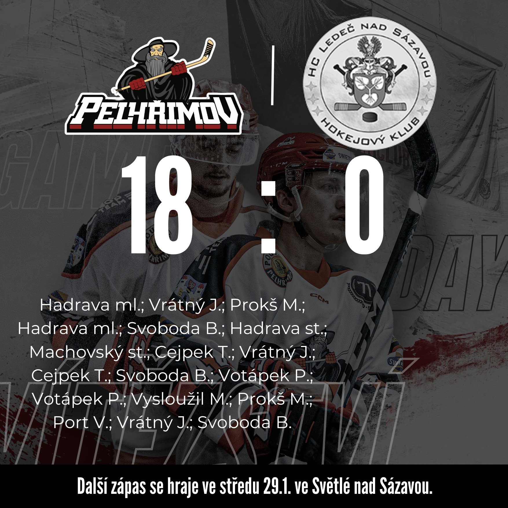 Pelhřimov na domácím ledě doslova zdevastoval tým z Ledče nad Sázavou po výsledku 18:0. Za domácí tým byl nejlepším hráčem utkání zvolen Marek Prokš, za hosty pak brankář Jakub Dundáček, který i přes deset inkasovaných gólů řadu dalších gólových šancí pelhřimovských střelců zlikvidoval. K dalšímu utkání zamíří Poutníci ve středu 29.ledna na horký led ve Světlé nad Sázavou.