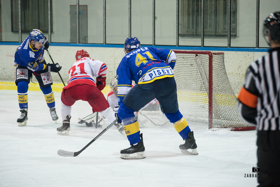 Také druhá třetina se zpočátku nesla v duchu tlaku domácího mužstva, Pipek byl ale na svém místě. Následné minuty hrál jednu z hlavních rolí sudí Jechoutek, který poněkud necitlivě posuzoval některé zákroky domácího celku - jedním z verdiktů rozhodčího byla i pětiminutová přesilová hra Písku za píchnutí hole pro Libora Bezděka, kterou hosté využili - ve 29. minutě se na správném místě objevil Sýbek a kombinaci svého týmu zakončil dvoubrankovým vedením pro písecký celek. Ale ve 30. minutě bylo z pohledu Pelhřimova veseleji - v pokračujícím oslabení našel Vylíčil Votápka, který poprvé rozjásal domácí publikum. Domácí mohli myslet i na vyrovnání stavu utkání, ve 34. minutě chyběly Marku Hadravovi centimetry v neúspěšné dorážce. O minutu později si chvilku slávy užil Černý, Sýbek už se radoval ze vstřelené branky, reflexivní zákrok Černého lapačky byl ale proti. Pohnout ukazatelem skóre mohl také ve 40. minutě hostující Růžička, trefil ale tyč domácí svatyně.