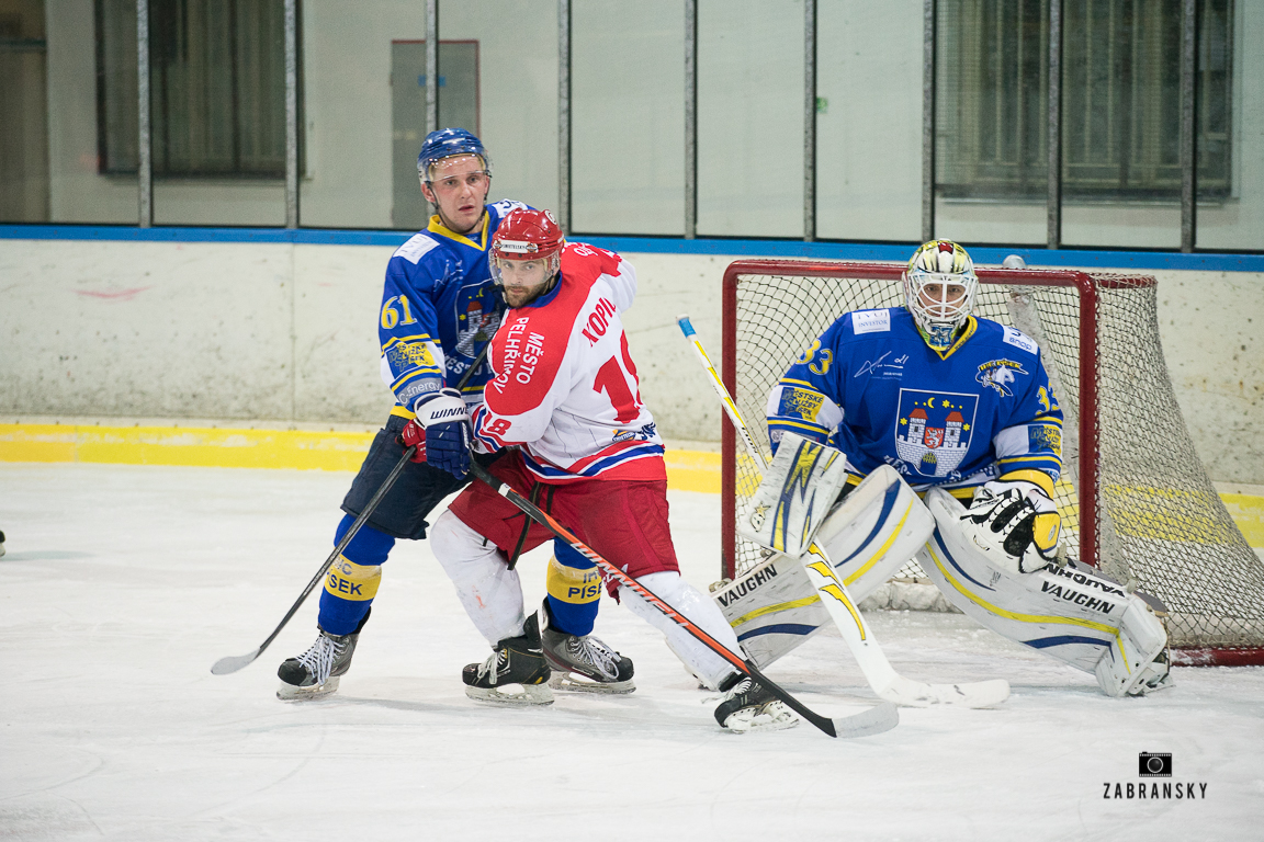 Jenže hosté chtěli rychle odpovědět, a to se jim podařilo. Rána z Portovy hole mířila do boční konstrukce, vzápětí ovšem hosté po chybné rozehrávce přečíslili obranu Písku a po šikovné přihrávce od Votápka zamířil přesně z pravého kruhu Jiří Kubát. I tak to nakonec byli hráči v modro-žlutých dresech, kteří si do první přestávky odnesli brankové vedení. Také druhá branka Písku měla shodného střelce. Josef Urbanec zamíchal s pukem před brankou soupeře a usměrnil černý kup pryže k levé tyči.