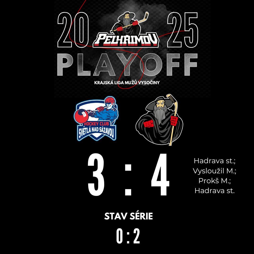 Čtvrtfinálová série mezi Pelhřimovem a Světlou nad Sázavou pokračovala u Sázavy druhým zápasem, kdy skóre utkání otevřeli hosté, ale domácí do první přestávky vyrovnali. Skláři se zkraje druhé třetiny dostali do vedení, ale ještě ve druhé třetině Poutníci vyrovnali a ve třetí třetině si pelhřimovští hokejisté vytvořili dvoubrankový náskok, který dokázali domácí v závěru utkání zdramatizovat, ale Poutníci si vítězství nenechali vzít a v příštím utkání mají Poutníci možnost celou sérii ukončit v nejkratším možném čase.