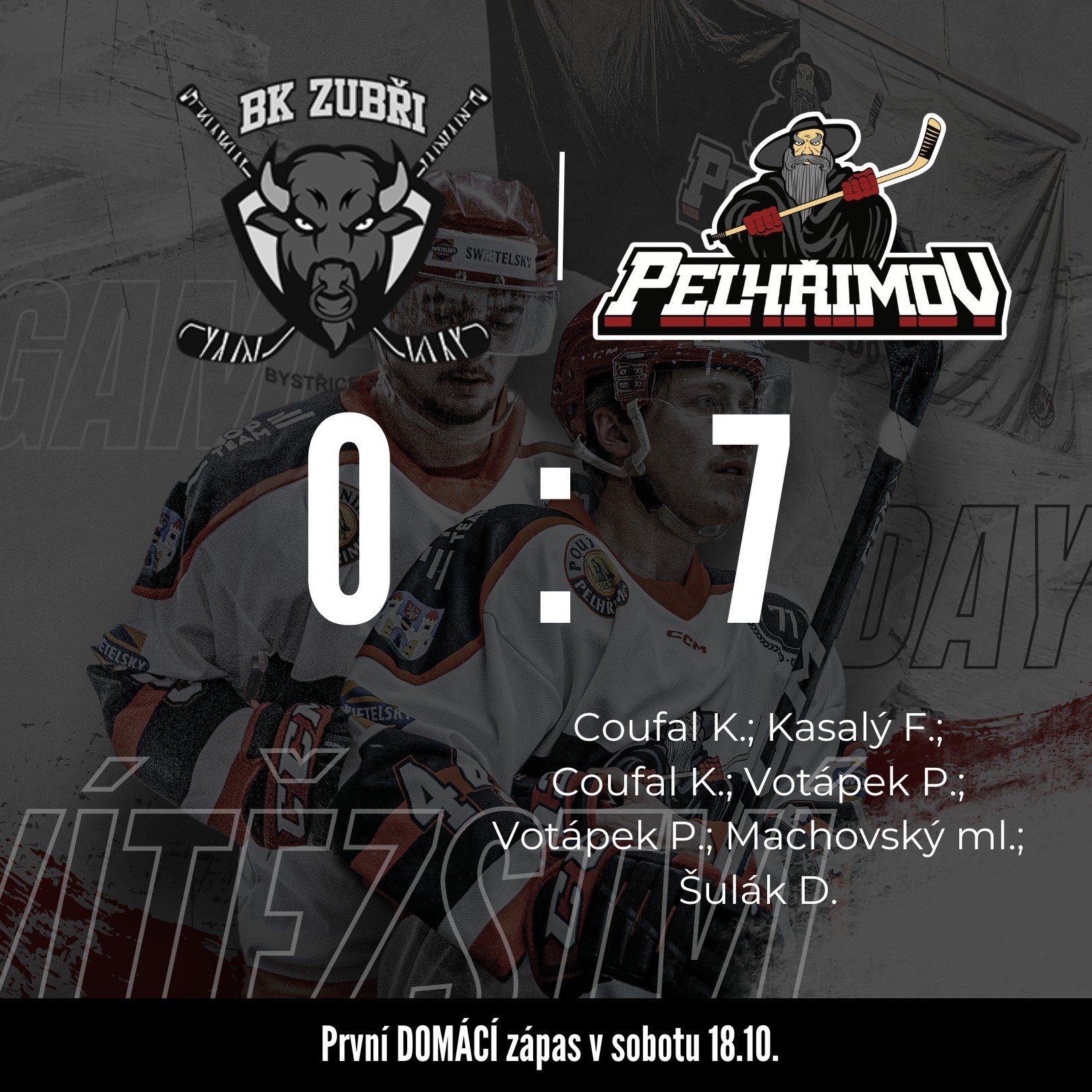 Branky a nahrávky: 13. Coufal (Marek Hadrava, Vrátný), 15. Coufal (Marek Hadrava), 21. Coufal (Marek Hadrava, F. Kasalý), 31. Šulák (Svoboda, Votápek), 48. Max Machovský (Kochrda), 50. Votápek (Svoboda, Glejtek), 57. Votápek. Rozhodčí: Svatopluk Kopeček — Šimon Slavík, Daniel Dočekal. Vyloučení: 5:3. Využití: 0:0. V oslabení: 0:0. Diváci: 50. Průběh zápasu: 0:7.